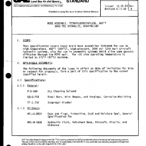This specification covers heavy braid hose assemblies intended for use in high-temperature, 400°F (204°C), high-pressure, 3000 psi (210 bar) aircraft hydraulic systems, also for use in pneumatic systems which allow some gaseous diffusion through the PTFE wall. The -20 size operating temperature is limited to 275°F (57°C) maximum.