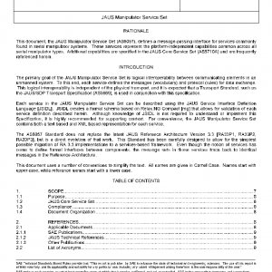 This document defines a set of standard application layer interfaces called JAUS Manipulator Services. JAUS Services provide the means for software entities in an unmanned system or system of unmanned systems to communicate and coordinate their activities. The Manipulator Services represent the platform-independent capabilities commonly found across all domains and types of unmanned systems. At present, nineteen (19) services are defined in this document. These services are categorized as: