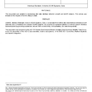 This standard defines the data interfaces between a host aircraft (“platform”) and an Electro-Optic/Infrared (EO/IR) sensor. These data interfaces cover various types of data including: imagery, metadata, command, status, and responses (CSR), geospatial postion, time, test and maintenance, and hand-controller. This standard does not cover mechanical or electrical interfaces.