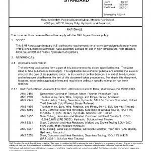 This SAE Aerospace Standard (AS) defines the requirements for a heavy duty polytetrafluoroethylene (PTFE) lined, metallic reinforced, hose assembly suitable for use in high temperature, high pressure, 4000 psi, aircraft and missile hydraulic fluid systems.