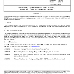 This Aerospace Standard (AS) defines the requirements for a heavy duty polytetrafluoroethylene (PTFE) lined, metallic reinforced, hose assembly suitable for use in high temperature, high pressure, 4000 psi, aircraft and missle hydraulic fluid systems.