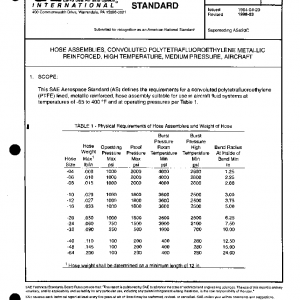 This SAE Aerospace Standard (AS) defines the requirements for a convoluted polytetrafluoroethylene (PTFE) lined, metallic reinforced, hose assembly suitable for use in aircraft fluid systems at temperatures of -65 to 400 °F and at operating pressures per Table 1.