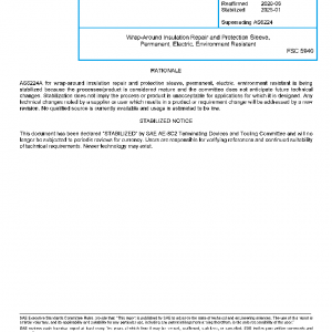 The AS6224 specification covers environment resistant, permanent insulation repair sleeves for repairing different types of insulation damages of wire or cable jackets in installed applications. The repair sleeve is intended to repair damaged primary wire or cable jacket covers where the shielding and wire conductors are not damaged.