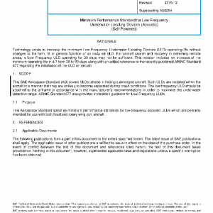 This SAE Aerospace Standard (AS) covers ULDs utilized in finding submerged aircraft. Such ULDs are installed within the aircraft in a manner that they are unlikely to become separated during crash conditions. The low frequency ULD should be attached to the airframe in accordance with the manufacturer’s recommendations in order to maximize the underwater detection range. ARINC Standard 677 also provides installation guidance for Low Frequency ULDs.