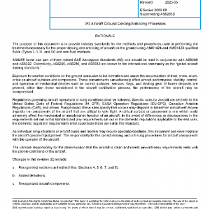 This SAE Aerospace Standard (AS) establishes the minimum requirements for ground-based aircraft deicing/anti-icing methods and procedures to ensure the safe operation of aircraft during icing conditions on the ground. This document does not specify the requirements for particular aircraft models.
