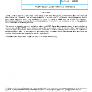 This SAE Aerospace Standard (AS) provides classical propulsion system performance parameter names for aircraft propulsion systems and their derivatives, and describes the logical framework by which new names can be constructed.