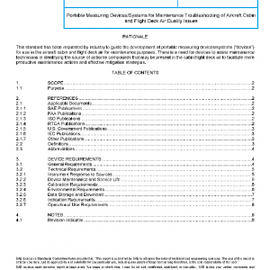The purpose of this standard is to aid manufacturers in creating devices that will provide maintenance staff with objective, reliable data consistent with certain types of airborne contaminants (“sources”), captured either during an event or during maintenance troubleshooting on the ground, in both cases for post-flight interpretation on the ground.