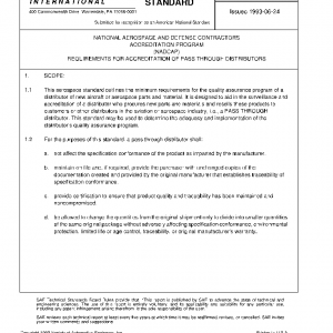 This aerospace standard outlines the minimum requirements for the quality assurance program of a distributor of new aircraft or aerospace parts and material. It is designed to aid in the surveillance and accreditation of a distributor who procures new parts and materials and resells these products to customers or other distributors in the aviation or aerospace industry, i.e., a PASS THROUGH distributor. This standard may be used to determine the adequacy and implementation of the distributor’s quality assurance program.