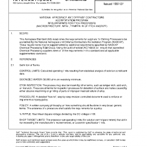 This Aerospace Standard (AS) establishes the requirements for suppliers for Etching Processes to be accredited by the National Aerospace and Defense Contractors Accreditation Program (NADCAP). These requirements may be supplemented by additional requirements specified by NADCAP Chemical Processing Task Group. Using the audit checklist (AC7108/2) will ensure that accredited Chemical Processing suppliers meet all of the requirements in this standard and all applicable supplementary standards.