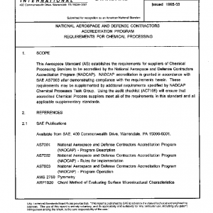 This Aerospace Standard (AS) establishes the requirements for suppliers of Chemical Processing Services to be accredited by the National Aerospace and Defense Contractors Accreditation Program (NADCAP). NADCAP accreditation is granted in accordance with SAE AS7003 after demonstrating compliance with the requirements herein. These requirements may be supplemented by additional requirements specified by NADCAP Chemical Processes Task Group. Using the audit checklist (AC7108) will ensure that accredited Chemical Process suppliers meet all of the requirements in this standard and all applicable supplementary standards.