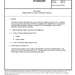 This SAE Aerospace Standard (AS) is to be used as a supplement to AS7109. In addition to the requirements contained in AS7109, the requirements contained herein shall apply to suppliers seeking Nadcap Coatings accreditation who are engaged in vapor deposit processes, except diffusion coatings.