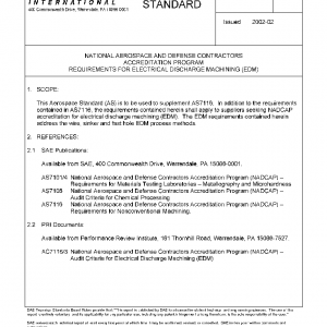 This Aerospace Standard (AS) is to be used to supplement AS7116. In addition to the requirements contained in AS7116, the requirements contained herein shall apply to suppliers seeking NADCAP accreditation for electrical discharge machining (EDM). The EDM requirements contained herein address the wire, sinker and fast hole EDM process methods.