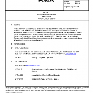 This Aerospace Standard (AS) establishes the requirements for suppliers of Electronics Printed Circuit Boards to be accredited by Nadcap. Nadcap accreditation is granted in accordance with SAE AS7003 after demonstrating compliance with the requirements herein. These requirements may be supplemented by additional requirements specified by Nadcap Electronics Task Group. Using the audit checklist (AC7119) will ensure that accredited Electronics Printed Circuit Boards suppliers meet all of the requirements in this standard and all applicable supplementary standards.