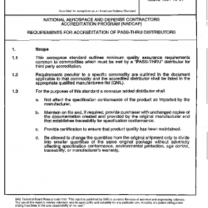 This aerospace standard outlines minimum quality assurance requirements common to commodities which must be met by a “PASS-THRU” distributor for third party accreditation.