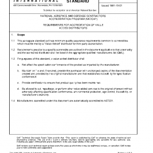 This aerospace standard outlines minimum quality assurance requirements common to commodities which must be met by a “Value Added” distributor for third party accreditation.