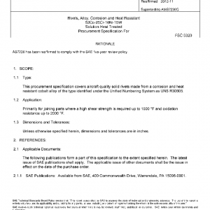 This procurement specification covers aircraft quality solid rivets made from a corrosion and heat resistant cobalt alloy of the type identified under the Unified Numbering System as UNS R30605.