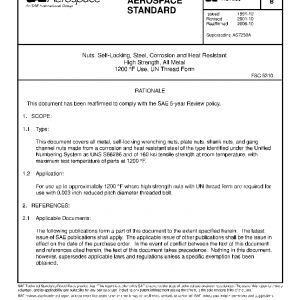 This document covers all metal, self-locking wrenching nuts, plate nuts, shank nuts, and gang channel nuts made from a corrosion and heat resistant steel of the type identified under the Unified Numbering System as UNS S66286 and of 160 ksi tensile strength at room temperature, with maximum test temperature of parts at 1200 °F.