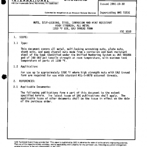 This document covers all metal, self-locking wrenching nuts, plate nuts, shank nuts, and gang channel nuts made from a corrosion and heat resistant steel of the type identified under the Unified Numbering System as UNS S66286 and of 160 000 psi tensile strength at room temperature, with maximum test temperature of parts at 1200 °F.