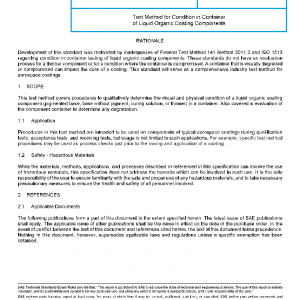 This test method covers procedures to qualitatively determine the visual and physical condition of a liquid organic coating component (pigmented base, base without pigment, curing solution, or thinner) in a container. Also covered is evaluation of the component container to determine any degradation.