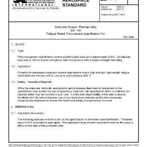This procurement specification covers aircraft-quality bolts and screws made of 6Al – 4V titanium alloy and of 160 ksi tensile strength at room temperature with a fatigue strength test rating.