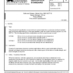 This procurement specification covers bolts and screws made from a corrosion and heat resistant, age hardenable nickel base alloy of the type identified under the Unified Numbering System as UNS N07718. The following specification designations and their properties are covered: