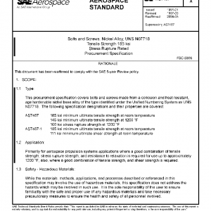This procurement specification covers bolts and screws made from a corrosion and heat resistant, age hardenable nickel base alloy of the type identified under the Unified Numbering System as UNS N07718. The following specification designations and their properties are covered: