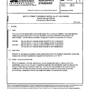 This procurement specification covers bolts made from a corrosion resistant, work-strengthened, cobalt-chromium-nickel alloy of the type identified under the Unified Numbering System as UNS R30035. The following specification designations and their properties are covered: