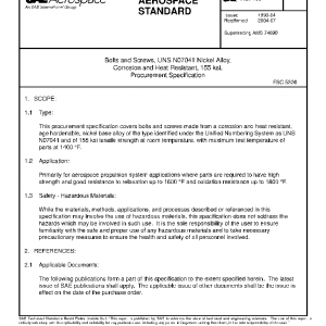 This procurement specification covers bolts and screws made from a corrosion and heat resistant, age hardenable, nickel base alloy of the type identified under the Unified Numbering System as UNS N07041 and of 155 ksi tensile strength at room temperature, with maximum test temperature of parts at 1400 °F.
