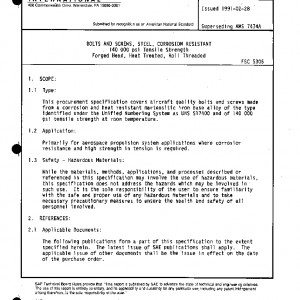 This procurement specification covers aircraft quality bolts and screws made from a corrosion and heat resistant martensitic iron base alloy of the type identified under the Unified Numbering System as UNS S17400 and of 140 000 psi tensile strength at room temperature.