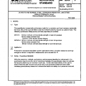 This specification covers bolts and screws made from a corrosion and heat resistant, martensitic iron base alloy of the type identified under the Unified Numbering System as UNS S17400. The following specification designations and their properties are covered: