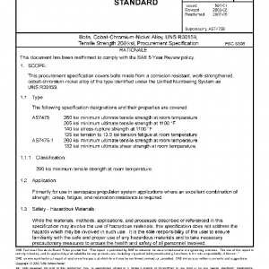 This procurement specification covers bolts made from a corrosion resistant, work-strengthened, cobalt-chromium-nickel alloy of the type identified under the Unified Numbering System as UNS R30159.
