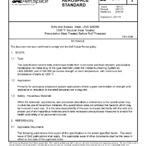This specification covers bolts and screws made from a corrosion and heat resistant, precipitation hardenable iron base alloy of the type identified under the Unified Numbering System as UNS S66286, and of 130 000 psi tensile strength at room temperature, with maximum test temperature of parts at 1200 °F.