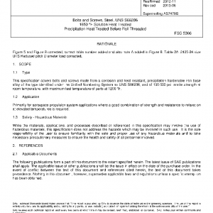 This specification covers bolts and screws made from a corrosion and heat resistant, precipitation hardenable iron base alloy of the type identified under the Unified Numbering System as UNS S66286, and of 130 000 psi tensile strength at room temperature, with maximum test temperature of parts at 1200 °F.
