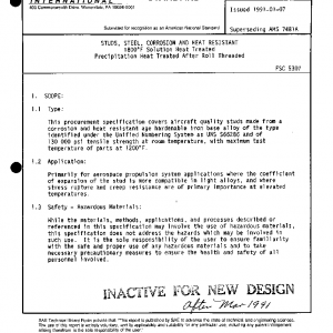 This procurement specification covers aircraft quality studs made from a corrosion and heat resistant age hardenable iron base alloy of the type identified under the Unified Numbering System as UNS S66286 and of 130 000 psi tensile strength at room temperature, with maximum test temperature of parts at 1200°F.