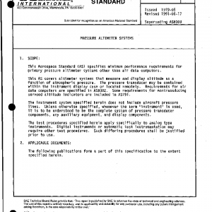 This AS covers altimeter systems that measure and display altitude as a function of atmospheric pressure. The pressure transducer may be contained within the instrument display case or located remotely. Requirements for air data computers are specified in AS8002. Some requirements for nontransducing servoed altitude indicators are included in AS791.