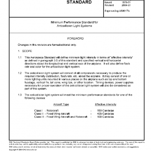 This Aerospace Standard will define minimum light intensity in terms of “effective intensity” as defined in paragraph 3.5 of this standard and specified vertical and horizontal directions about the longitudinal and vertical axis of the airplane. It will also define flash rate and color for the anticollision light system.