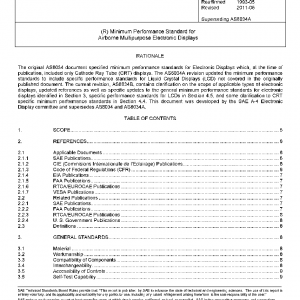 This SAE Aerospace Standard (AS) specifies minimum performance standards for all types of Electronic Displays and Electronic Display Systems that are intended for use in the flight deck by the flightcrew in all 14 CFR Part 23, 25, 27, and 29 aircraft. The requirements and recommendations in this document are intended to apply to all installed electronic displays and electronic display systems within the flight deck, regardless of intended function, criticality, or location within the flight deck, but may also be used for non-installed electronic displays. This document provides baseline requirements and recommendations (see section 2.3 for definitions of “shall” and “should”). This document primarily addresses hardware requirements, such as electrical, mechanical, optical, and environmental. It does not address system specific functions. It does not contain an exhaustive or comprehensive list of requirements for specific systems or functions, such as TCAS, ADS-B, GPS, weather, or shared display considerations (e.g., when should alerts be inhibited on a display system that simultaneously depicts navigation data integrated with terrain data or traffic alerting). This document is intended to be used in combination with other guidance material contained in current system specific, TSOs, Advisory Circulars (ACs), and other Federal Aviation Administration (FAA)-approved guidance material.