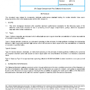 This SAE Aerospace Standard (AS) specifies minimum performance standards for the following types of fire detection instruments intended for use in protecting aircraft cargo compartments, galleys, electronic equipment bays and other similar installations.