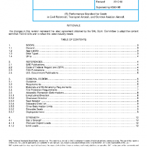 This SAE Aerospace Standard (AS) defines minimum performance standards, qualification requirements, and minimum documentation requirements for passenger and crew seats in civil rotorcraft, transport aircraft, and general aviation aircraft. The goal is to achieve comfort, durability, and occupant protection under normal operational loads and to define test and evaluation criteria to demonstrate occupant protection when a seat/occupant/restraint system is subjected to statically applied ultimate loads and to dynamic impact test conditions set forth in the applicable Federal Regulations 14 CFR 23, 25, 27, or 29.