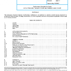 This SAE Aerospace Standard (AS) defines minimum performance standards, qualification requirements, and minimum documentation requirements for passenger and crew seats in civil rotorcraft, transport aircraft, and general aviation aircraft. The goal is to achieve comfort, durability, and occupant protection under normal operational loads and to define test and evaluation criteria to demonstrate occupant protection when a seat/occupant/restraint system is subjected to statically applied ultimate loads and to dynamic impact test conditions set forth in Title 14, Code of Federal Regulations (14 CFR) parts 23, 25, 27, or 29 (as applicable to the seat type, see Table 1).