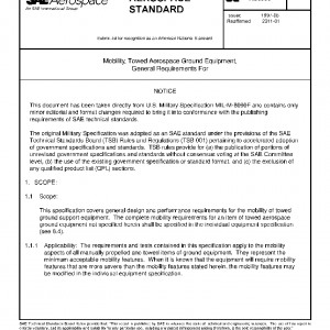 This specification covers general design and performance requirements for the mobility of towed ground support equipment. The complete mobility requirements for an item of towed aerospace ground equipment not specified herein shall be specified in the individual equipment specification (see 6.4).