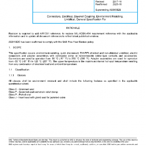 This specification covers environment-resisting, quick disconnect, EMI/RFI shielded and non-shielded umbilical, electric connectors and adapter assemblies with removable crimp or nonremovable solder-type contacts and accessories. Connectors are rated for operation from -55 °C (-67 °F) to 200 °C (392 °F). Adapter assemblies are rated for operation from -55 °C (-67 °F) to 125 °C (257 °F). The upper temperature is the maximum internal hot spot temperature resulting from any combination of electrical load and ambient temperature.