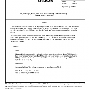 This specification covers plain rod end bearings, corrosion resistant steel (CRES) or alloy steel, which are self-aligning and self-lubricating by incorporating polytetrafluoroethylene (PTFE) in a liner between the ball and race for use in the temperature range -65 to +325 °F (-54 to +163 °C).