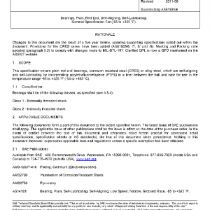 This specification covers plain rod end bearings, corrosion resistant steel (CRES) or alloy steel, which are self-aligning and self-lubricating by incorporating polytetrafluoroethylene (PTFE) in a liner between the ball and race for use in the temperature range -65 to +325 °F (-54 to +163 °C).