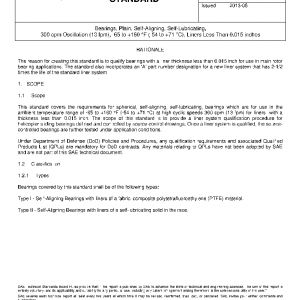 This standard covers the requirements for spherical, self-aligning, self-lubricating, bearings which are for use in the ambient temperature range of -65 to +160 °F (-54 to +71 °C) at high cyclic speeds 300 cpm (13 fpm) for liners with a thickness less than 0.015 inch. The scope of this standard is to provide a liner system qualification procedure for helicopter sliding bearings defined and controlled by source control drawings. Once a liner system is qualified, the source-controlled bearings are further tested under application conditions.