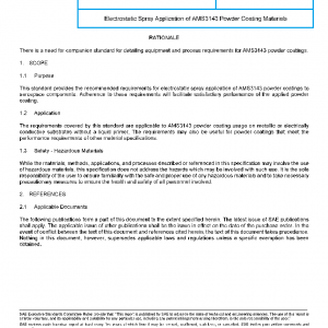 This standard provides the recommended requirements for electrostatic spray application of AMS3143 powder coatings to aerospace components. Adherence to these requirements will facilitate satisfactory performance of the applied powder coating.
