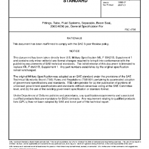 This specification covers the design requirements and test procedures for separable beam seal fittings which includes end fittings (see 6.10.3), fitting bodies (see 6.10.6), and boss fittings (see 6.10.1) for use in aerospace fluid systems. Design requirements are for class 3000 in corrosion resistant steel (CRES) only and for class 4000 in titanium alloy (Ti) only. Definition of fittings and related terms are defined in 6.10.