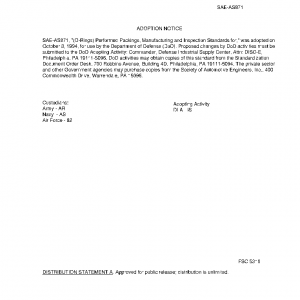 This specification controls surface condition, manufacturing defects and inspection requirements, and defines methods of measurement for elastomeric toroidal sealing rings (O-rings) for static (including gasket) applications.