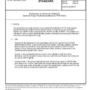 This specification and part standard covers polytetrafluoroethylene (PTFE) resin material and the dimensional requirements for retainers (back-up rings) previously covered by AS8791 and AS8791/1 which superseded MIL-R-8791 and MIL-R-8791/1. The retainers are intended for use in hydraulic and pneumatic system components as anti-extrusion devices in conjunction with packings and O-rings.