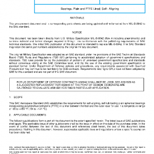 This SAE Aerospace Standard (AS) establishes the requirements for self-aligning, self-lubricating plain spherical bearings incorporating polytetrafluoroethylene (PTFE) in a liner between the ball and the outer race for use in a temperature range of -65 to +250 °F (-54 to +121 °C).
